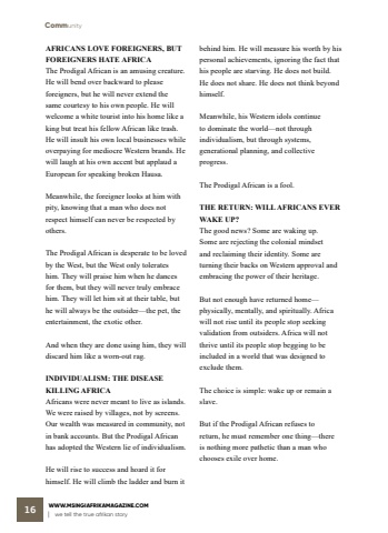 CommunityWWW.MSINGIAFRIKAMAGAZINE.COM | we tell the true afrikan story 16AFRICANS LOVE FOREIGNERS, BUT FOREIGNERS HATE AFRICAThe Prodigal African is an amusing creature. He will bend over backward to please foreigners, but he will never extend the same courtesy to his own people. He will welcome a white tourist into his home like a king but treat his fellow African like trash. He will insult his own local businesses while overpaying for mediocre Western brands. He will laugh at his own accent but applaud a European for speaking broken Hausa.Meanwhile, the foreigner looks at him with pity, knowing that a man who does not respect himself can never be respected by others.The Prodigal African is desperate to be loved by the West, but the West only tolerates him. They will praise him when he dances for them, but they will never truly embrace him. They will let him sit at their table, but he will always be the outsider%u2014the pet, the entertainment, the exotic other.And when they are done using him, they will discard him like a worn-out rag.INDIVIDUALISM: THE DISEASE KILLING AFRICAAfricans were never meant to live as islands. We were raised by villages, not by screens. Our wealth was measured in community, not in bank accounts. But the Prodigal African has adopted the Western lie of individualism.He will rise to success and hoard it for himself. He will climb the ladder and burn it behind him. He will measure his worth by his personal achievements, ignoring the fact that his people are starving. He does not build. He does not share. He does not think beyond himself.Meanwhile, his Western idols continue to dominate the world%u2014not through individualism, but through systems, generational planning, and collective progress.The Prodigal African is a fool.THE RETURN: WILL AFRICANS EVER WAKE UP?The good news? Some are waking up. Some are rejecting the colonial mindset and reclaiming their identity. Some are turning their backs on Western approval and embracing the power of their heritage.But not enough have returned home%u2014physically, mentally, and spiritually. Africa will not rise until its people stop seeking validation from outsiders. Africa will not thrive until its people stop begging to be included in a world that was designed to exclude them.The choice is simple: wake up or remain a slave.But if the Prodigal African refuses to return, he must remember one thing%u2014there is nothing more pathetic than a man who chooses exile over home.