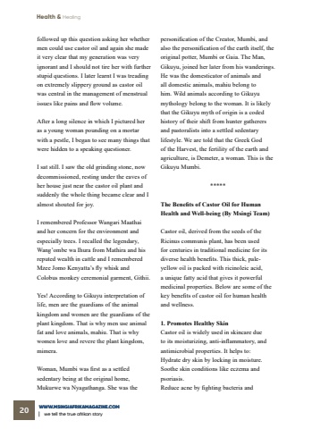 Health & HealingWWW.MSINGIAFRIKAMAGAZINE.COM | we tell the true afrikan story 20followed up this question asking her whether men could use castor oil and again she made it very clear that my generation was very ignorant and I should not tire her with further stupid questions. I later learnt I was treading on extremely slippery ground as castor oil was central in the management of menstrual issues like pains and flow volume.After a long silence in which I pictured her as a young woman pounding on a mortar with a pestle, I began to see many things that were hidden to a speaking questioner. I sat still. I saw the old grinding stone, now decommissioned, resting under the eaves of her house just near the castor oil plant and suddenly the whole thing became clear and I almost shouted for joy. I remembered Professor Wangari Maathai and her concern for the environment and especially trees. I recalled the legendary, Wang%u2019ombe wa Ihura from Mathira and his reputed wealth in cattle and I remembered Mzee Jomo Kenyatta%u2019s fly whisk and Colobus monkey ceremonial garment, Githii. Yes! According to Gikuyu interpretation of life, men are the guardians of the animal kingdom and women are the guardians of the plant kingdom. That is why men use animal fat and love animals, mahiu. That is why women love and revere the plant kingdom, mimera. Woman, Mumbi was first as a settled sedentary being at the original home, Mukurwe wa Nyagathanga. She was the personification of the Creator, Mumbi, and also the personification of the earth itself, the original potter, Mumbi or Gaia. The Man, Gikuyu, joined her later from his wanderings. He was the domesticator of animals and all domestic animals, mahiu belong to him. Wild animals according to Gikuyu mythology belong to the woman. It is likely that the Gikuyu myth of origin is a coded history of their shift from hunter gatherers and pastoralists into a settled sedentary lifestyle. We are told that the Greek God of the Harvest, the fertility of the earth and agriculture, is Demeter, a woman. This is the Gikuyu Mumbi.*****The Benefits of Castor Oil for Human Health and Well-being (By Msingi Team)Castor oil, derived from the seeds of the Ricinus communis plant, has been used for centuries in traditional medicine for its diverse health benefits. This thick, paleyellow oil is packed with ricinoleic acid, a unique fatty acid that gives it powerful medicinal properties. Below are some of the key benefits of castor oil for human health and wellness.1. Promotes Healthy SkinCastor oil is widely used in skincare due to its moisturizing, anti-inflammatory, and antimicrobial properties. It helps to:Hydrate dry skin by locking in moisture.Soothe skin conditions like eczema and psoriasis.Reduce acne by fighting bacteria and