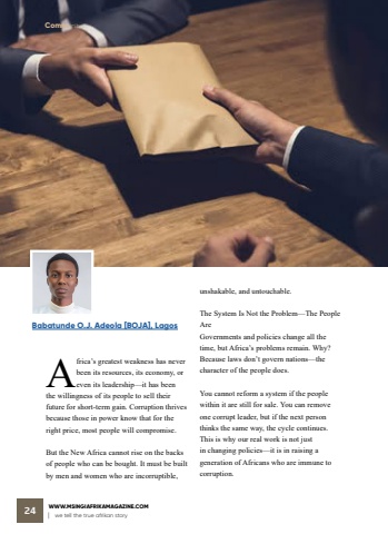 LeadershipWWW.MSINGIAFRIKAMAGAZINE.COM | we tell the true afrikan story 24Africa%u2019s greatest weakness has never been its resources, its economy, or even its leadership%u2014it has been the willingness of its people to sell their future for short-term gain. Corruption thrives because those in power know that for the right price, most people will compromise.But the New Africa cannot rise on the backs of people who can be bought. It must be built by men and women who are incorruptible, unshakable, and untouchable.The System Is Not the Problem%u2014The People AreGovernments and policies change all the time, but Africa%u2019s problems remain. Why? Because laws don%u2019t govern nations%u2014the character of the people does.You cannot reform a system if the people within it are still for sale. You can remove one corrupt leader, but if the next person thinks the same way, the cycle continues. This is why our real work is not just in changing policies%u2014it is in raising a generation of Africans who are immune to corruption.Babatunde O.J. Adeola [BOJA], LagosCommunity