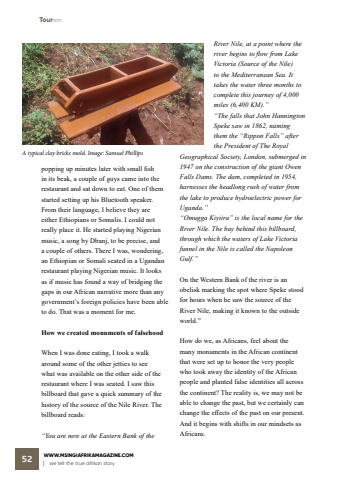 TourismWWW.MSINGIAFRIKAMAGAZINE.COM | we tell the true afrikan story 52popping up minutes later with small fish in its beak, a couple of guys came into the restaurant and sat down to eat. One of them started setting up his Bluetooth speaker. From their language, I believe they are either Ethiopians or Somalis. I could not really place it. He started playing Nigerian music, a song by Dbanj, to be precise, and a couple of others. There I was, wondering, an Ethiopian or Somali seated in a Ugandan restaurant playing Nigerian music. It looks as if music has found a way of bridging the gaps in our African narrative more than any government%u2019s foreign policies have been able to do. That was a moment for me.How we created monuments of falsehood When I was done eating, I took a walk around some of the other jetties to see what was available on the other side of the restaurant where I was seated. I saw this billboard that gave a quick summary of the history of the source of the Nile River. The billboard reads:%u201cYou are now at the Eastern Bank of the River Nile, at a point where the river begins to flow from Lake Victoria (Source of the Nile) to the Mediterranean Sea. It takes the water three months to complete this journey of 4,000 miles (6,400 KM).%u201d%u201cThe falls that John Hannington Speke saw in 1862, naming them the %u201cRippon Falls%u201d after the President of The Royal Geographical Society, London, submerged in 1947 on the construction of the giant Owen Falls Dams. The dam, completed in 1954, harnesses the headlong rush of water from the lake to produce hydroelectric power for Uganda.%u201d%u201cOmugga Kiyiira%u201d is the local name for the River Nile. The bay behind this billboard, through which the waters of Lake Victoria funnel in the Nile is called the Napoleon Gulf.%u201dOn the Western Bank of the river is an obelisk marking the spot where Speke stood for hours when he saw the source of the River Nile, making it known to the outside world.%u201dHow do we, as Africans, feel about the many monuments in the African continent that were set up to honor the very people who took away the identity of the African people and planted false identities all across the continent? The reality is, we may not be able to change the past, but we certainly can change the effects of the past on our present. And it begins with shifts in our mindsets as Africans.A typical clay bricks mold. Image: Samuel Phillips
