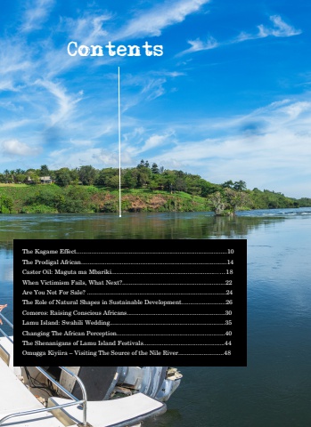 LeadershipWWW.MSINGIAFRIKAMAGAZINE.COM | we tell the true afrikan story 6ContentsThe Kagame Effect.........................................................................................10The Prodigal African......................................................................................14Castor Oil: Maguta ma Mbariki..................................................................18When Victimism Fails, What Next?.............................................................22Are You Not For Sale? ..................................................................................24The Role of Natural Shapes in Sustainable Development..........................26Comoros: Raising Conscious Africans..........................................................30Lamu Island: Swahili Wedding....................................................................35Changing The African Perception................................................................40The Shenanigans of Lamu Island Festivals................................................44Omugga Kiyiira %u2013 Visiting The Source of the Nile River...........................48
