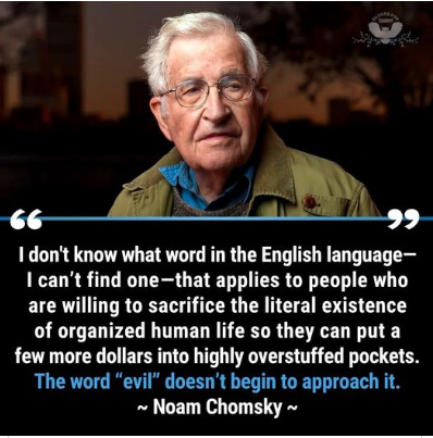 I like how Noam Chomsky puts it when he said “I don’t know what word in the English language-I can’t find one-that applies to people who are willing to sacrifice the literal existence of organized human life so they can put a few more dollars into highly overstuffed pockets. The word “evil” doesn’t begin to approach it.”