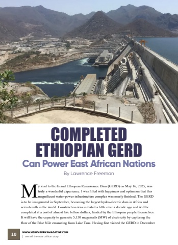LeadershipWWW.MSINGIAFRIKAMAGAZINE.COM | we tell the true afrikan story 10COMPLETED ETHIOPIAN GERDCan Power East African NationsBy Lawrence FreemanMy visit to the Grand Ethiopian Renaissance Dam (GERD) on May 16, 2025, was truly a wonderful experience. I was filled with happiness and optimism that this magnificent water-power infrastructure complex was nearly finished. The GERD is to be inaugurated in September, becoming the largest hydro-electric dam in Africa and seventeenth in the world. Construction was initiated a little over a decade ago and will be completed at a cost of almost five billion dollars, funded by the Ethiopian people themselves. It will have the capacity to generate 5,150 megawatts (MW) of electricity by capturing the flow of the Blue Nile emanating from Lake Tana. Having first visited the GERD in December