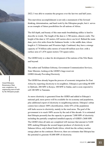 LeadershipISSUE 39 | JULY 2025 112022; I was able to examine the progress over the last two and half years.This marvelous accomplishment is not only a monument of the forward thinking, determination, and hard work by the Ethiopian people, but it serves as an example of future possibilities for all nations of Africa.The full depth, and beauty of this man-made breathtaking edifice is hard to describe in words. The length of the dam is 1,780 meters, almost a mile. The height of the dam is 145 meters, 645 meters above sea level. Behind the main dam, just a few miles from the Sudanese border is the saddle dam, whose length is 5.2 kilometers and 50 meters high. Combined, they have a storage capacity of 74 billion cubic meters of water-60 million acre feet ,with a surface area of 1,874 square meters-724 square miles.The GERD truly is a dam for development of the nations of the Nile Basin and beyond.The author and Tesfahun Gobezay, Government Communication Services, State Minister, looking at the GERD%u2019s huge reservoirGERD Already Providing ElectricityThe GERD has already begun the process of economic integration for East Africa by exporting electricity to its neighbors. Ethiopia is providing 80 MW to Djibouti, 200 MW to Kenya, 100 MW to Sudan, and is soon expected to sell 100 MW to Tanzania.As more electricity is generated from the GERD and added to Ethiopia%u2019s national grid, more power will be available for its economy and population, plus additional export of electricity to neighboring nations. Ethiopia%u2019s urban centers have almost 100% electrification, while 45% of the population still lacks access to electricity, mainly in the rural areas. The goal of the government is to reach 100% access by the end of this decade. It is estimated that Ethiopia presently has the capacity to generate 7,000 MW of electricity including the partially completed installed capacity of GERD%u2019s 2600 MW. The GERD when all units are completed will increase that amount to 9,630 MW, making Ethiopia the second largest producer of electricity in subSaharan Africa, only behind South Africa, which has the solitary nuclear energy plant on the continent. However, there are estimates that Ethiopia has the potential to generate 45,000 MW of electricity.Grand Ethiopian Renaissance Dam near completion. An engineering marvel built by the Ethiopian people.