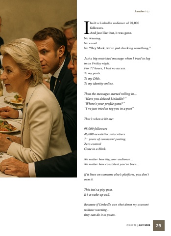 LeadershipISSUE 39 | JULY 2025 29I built a LinkedIn audience of 98,000 followers.And just like that, it was gone.No warning.No email.No %u201cHey Mark, we%u2019re just checking something.%u201dJust a big restricted message when I tried to log in on Friday night.For 72 hours, I had no access.To my posts.To my DMs.To my identity online.Then the messages started rolling in%u2026%u201cHave you deleted LinkedIn?%u201d%u201cWhere%u2019s your profile gone?%u201d%u201cI%u2019ve just tried to tag you in a post%u201dThat%u2019s when it hit me:98,000 followers46,000 newsletter subscribers7+ years of consistent postingZero controlGone in a blink.No matter how big your audience%u2026No matter how consistent you%u2019ve been%u2026If it lives on someone else%u2019s platform, you don%u2019t own it.This isn%u2019t a pity post.It%u2019s a wake-up call.Because if LinkedIn can shut down my account without warning%u2026they can do it to yours.