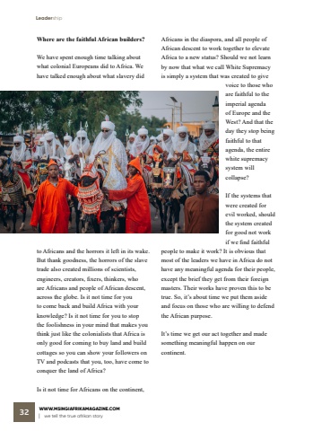 LeadershipWWW.MSINGIAFRIKAMAGAZINE.COM | we tell the true afrikan story 32Where are the faithful African builders?We have spent enough time talking about what colonial Europeans did to Africa. We have talked enough about what slavery did to Africans and the horrors it left in its wake. But thank goodness, the horrors of the slave trade also created millions of scientists, engineers, creators, fixers, thinkers, who are Africans and people of African descent, across the globe. Is it not time for you to come back and build Africa with your knowledge? Is it not time for you to stop the foolishness in your mind that makes you think just like the colonialists that Africa is only good for coming to buy land and build cottages so you can show your followers on TV and podcasts that you, too, have come to conquer the land of Africa?Is it not time for Africans on the continent, Africans in the diaspora, and all people of African descent to work together to elevate Africa to a new status? Should we not learn by now that what we call White Supremacy is simply a system that was created to give voice to those who are faithful to the imperial agenda of Europe and the West? And that the day they stop being faithful to that agenda, the entire white supremacy system will collapse? If the systems that were created for evil worked, should the system created for good not work if we find faithful people to make it work? It is obvious that most of the leaders we have in Africa do not have any meaningful agenda for their people, except the brief they get from their foreign masters. Their works have proven this to be true. So, it%u2019s about time we put them aside and focus on those who are willing to defend the African purpose.It%u2019s time we get our act together and made something meaningful happen on our continent.