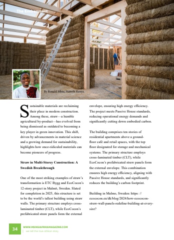 The EnvironmentWWW.MSINGIAFRIKAMAGAZINE.COM | we tell the true afrikan story 34The EnvironmentSustainable materials are reclaiming their place in modern construction. Among these, straw%u2014a humble agricultural by-product%u2014has evolved from being dismissed as outdated to becoming a key player in green innovation. This shift, driven by advancements in material science and a growing demand for sustainability, highlights how once-ridiculed materials can become pioneers of progress.Straw in Multi-Storey Construction: A Swedish BreakthroughOne of the most striking examples of straw%u2019s transformation is ETC Bygg and EcoCocon%u2019s 12-story project in Malm%u00f6, Sweden. Slated for completion in 2025, this structure is set to be the world%u2019s tallest building using straw walls. The primary structure employs crosslaminated timber (CLT), while EcoCocon%u2019s prefabricated straw panels form the external envelope, ensuring high energy efficiency. The project meets Passive House standards, reducing operational energy demands and significantly cutting down embodied carbon.The building comprises ten stories of residential apartments above a groundfloor caf%u00e9 and retail spaces, with the top floor designated for storage and mechanical systems. The primary structure employs cross-laminated timber (CLT), while EcoCocon%u2019s prefabricated straw panels form the external envelope. This combination ensures high energy efficiency, aligning with Passive House standards, and significantly reduces the building%u2019s carbon footprint.Building in Malmo, Sweden: https: //ecococon.eu/dk/blog/2024/how-ecococonstraw-wall-panels-redefine-building-at-everysize?By Ronald Mbiu, Nairobi Kenya.