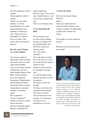 CommunityWWW.MSINGIAFRIKAMAGAZINE.COM | we tell the true afrikan story 38The West taught the world to conquer.Africa taught the world to connect.Ubuntu is not just about kindness. It is about interdependence. It is about understanding that your humanity is bound up in mine. That no success is meaningful if it comes at the cost of others. That power, when it disconnects, destroys.But why wasn%u2019t Ubuntu ever on the syllabus?You can get a degree in philosophy in elite European universities and never read a single African thinker.You can learn about Aristotle and Descartes, but never about Mogobe Ramose, John Mbiti, or Kwasi Wiredu.You can be taught the Renaissance, Enlightenment, and Scientific Revolution, but not the African concepts of personhood, communal morality, or restorative justice.Was it ignorance?Or was it intentional?Ubuntu is a threat to systems built on hierarchy.Because it demands equality.Because it challenges the myth of supremacy.Because it says, %u201cYou are not more valuable than me%u2014and I am not more valuable than you.%u201dThat is a revolutionary idea.A New World Must Be BuiltWe are entering a new era. The world is shifting. Systems are shaking. And the old philosophies that built those systems are showing cracks.Now is the time to remember.Now is the time to reclaim.Now is the time to re-teach the world what they forgot or refused to learn.Ubuntu is not just African.It is humanity%u2019s missing code.It is what the future needs.Because the future is not for the supreme.The future is not for the arrogant.The future is for those who remember their humanity.The future is for those who see that justice is not revenge%u2014it is restoration.That power is not domination; it is service.A Call to the WorldDon%u2019t just read about Ubuntu.Practice it.Share it.Teach your children about it.And to my fellow Africans, your wisdom is needed. Your philosophy is global. Don%u2019t shrink it for anyone.They taught us to look outside for answers.But what if the answer has always been within?Yaw Kissi is a Pan-African communicator with a financial mind, passionate about reshaping Africa%u2019s narrative. He has built a thriving LinkedIn community of over 40,000 by writing bold, thought-provoking stories that spotlight Africa%u2019s challenges, innovations, and rising voices. Through digital storytelling across platforms like Facebook and YouTube, Yaw sparks meaningful conversations on economic policy, youth empowerment, and business culture always with a focus on what truly matters in Africa today.