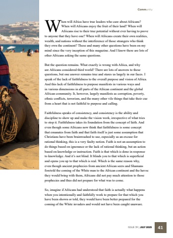 CommunityISSUE 39 | JULY 2025 41When will Africa have true leaders who care about Africans? When will Africans enjoy the fruit of their land? When will Africans rise to their true potential without ever having to prove to anyone that they have one? When will Africans create their own realities, wealth, and nations without the interference of those strangers who think they own the continent? These and many other questions have been on my mind since the very inception of this magazine. And I know there are lots of other Africans asking the same questions.But the question remains. What exactly is wrong with Africa, and why are Africans considered third world? There are lots of answers to these questions, but one answer remains true and stares us largely in our faces. I speak of the lack of faithfulness to the overall purpose and vision of Africa. And this lack of faithfulness to purpose manifests in various ways and in various dimensions in all parts of the African continent and the global African community. It, however, largely manifests as corruption, poverty, ethnic conflicts, terrorism, and the many other vile things that take their cue from a heart that is not faithful to purpose and calling. Faithfulness speaks of consistency, and consistency is the ability and discipline to show up and make the vision work, irrespective of what tries to stop it. Faithfulness takes its foundation from the concept of faith. And even though some Africans now think that faithfulness is some concept that emanates from faith and that faith itself is just some assumption that Christians have been brainwashed to use, especially as an excuse for rational thinking, this is a very faulty notion. Faith is not an assumption to do things based on ignorance or the lack of rational thinking, but an action based on knowledge or instruction. Faith is that which is done in response to knowledge. And it%u2019s not blind. It blinds you to that which is superficial and opens you up to that which is real. Which is the same reason why, even though ancient prophecies from ancient African seers and Shamans foretold the coming of the White man to the African continent and the havoc they would bring with them, Africans did not pay much attention to those prophecies and thus did not prepare for what was to come. So, imagine if Africans had understood that faith is actually what happens when you intentionally and faithfully work to prepare for that which you have been shown or told, they would have been better prepared for the coming of the White invaders and would not have been caught unaware.