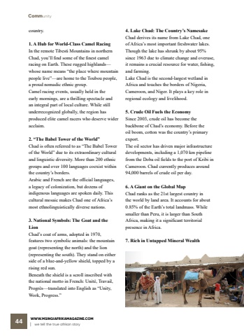 CommunityWWW.MSINGIAFRIKAMAGAZINE.COM | we tell the true afrikan story 44country.1. A Hub for World-Class Camel RacingIn the remote Tibesti Mountains in northern Chad, you%u2019ll find some of the finest camel racing on Earth. These rugged highlands%u2014whose name means %u201cthe place where mountain people live%u201d%u2014are home to the Toubou people, a proud nomadic ethnic group.Camel racing events, usually held in the early mornings, are a thrilling spectacle and an integral part of local culture. While still underrecognized globally, the region has produced elite camel racers who deserve wider acclaim.2. %u201cThe Babel Tower of the World%u201dChad is often referred to as %u201cThe Babel Tower of the World%u201d due to its extraordinary cultural and linguistic diversity. More than 200 ethnic groups and over 100 languages coexist within the country%u2019s borders.Arabic and French are the official languages, a legacy of colonization, but dozens of indigenous languages are spoken daily. This cultural mosaic makes Chad one of Africa%u2019s most ethnolinguistically diverse nations.3. National Symbols: The Goat and the LionChad%u2019s coat of arms, adopted in 1970, features two symbolic animals: the mountain goat (representing the north) and the lion (representing the south). They stand on either side of a blue-and-yellow shield, topped by a rising red sun.Beneath the shield is a scroll inscribed with the national motto in French: Unit%u00e9, Travail, Progr%u00e8s%u2014translated into English as %u201cUnity, Work, Progress.%u201d4. Lake Chad: The Country%u2019s NamesakeChad derives its name from Lake Chad, one of Africa%u2019s most important freshwater lakes. Though the lake has shrunk by about 95% since 1963 due to climate change and overuse, it remains a crucial resource for water, fishing, and farming.Lake Chad is the second-largest wetland in Africa and touches the borders of Nigeria, Cameroon, and Niger. It plays a key role in regional ecology and livelihood.5. Crude Oil Fuels the EconomySince 2003, crude oil has become the backbone of Chad%u2019s economy. Before the oil boom, cotton was the country%u2019s primary export.The oil sector has driven major infrastructure developments, including a 1,070 km pipeline from the Doba oil fields to the port of Kribi in Cameroon. Chad currently produces around 94,000 barrels of crude oil per day.6. A Giant on the Global MapChad ranks as the 21st largest country in the world by land area. It accounts for about 0.85% of the Earth%u2019s total landmass. While smaller than Peru, it is larger than South Africa, making it a significant territorial presence in Africa.7. Rich in Untapped Mineral Wealth
