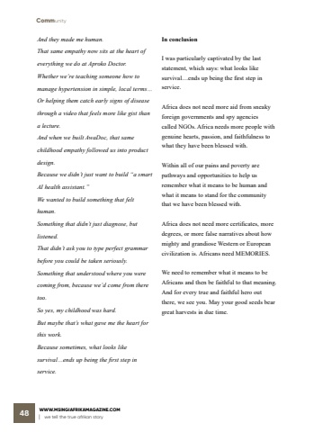 CommunityWWW.MSINGIAFRIKAMAGAZINE.COM | we tell the true afrikan story 48And they made me human.That same empathy now sits at the heart of everything we do at Aproko Doctor.Whether we%u2019re teaching someone how to manage hypertension in simple, local terms%u2026Or helping them catch early signs of disease through a video that feels more like gist than a lecture. And when we built AwaDoc, that same childhood empathy followed us into product design.Because we didn%u2019t just want to build %u201ca smart AI health assistant.%u201dWe wanted to build something that felt human.Something that didn%u2019t just diagnose, but listened.That didn%u2019t ask you to type perfect grammar before you could be taken seriously.Something that understood where you were coming from, because we%u2019d come from there too.So yes, my childhood was hard.But maybe that%u2019s what gave me the heart for this work.Because sometimes, what looks like survival%u2026ends up being the first step in service.In conclusionI was particularly captivated by the last statement, which says: what looks like survival%u2026ends up being the first step in service.Africa does not need more aid from sneaky foreign governments and spy agencies called NGOs. Africa needs more people with genuine hearts, passion, and faithfulness to what they have been blessed with. Within all of our pains and poverty are pathways and opportunities to help us remember what it means to be human and what it means to stand for the community that we have been blessed with.Africa does not need more certificates, more degrees, or more false narratives about how mighty and grandiose Western or European civilization is. Africans need MEMORIES. We need to remember what it means to be Africans and then be faithful to that meaning. And for every true and faithful hero out there, we see you. May your good seeds bear great harvests in due time.