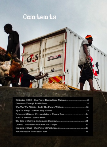 LeadershipWWW.MSINGIAFRIKAMAGAZINE.COM | we tell the true afrikan story 6ContentsEthiopian GERD - Can Power East African Nations...............................,....10Greatness Through Faithfulness...................................................................14Win The War Within - Build The Future Without.......................................16Njia Ya Mbegu - Africa%u2019s Way of Seed..........................................................20Pain and Gikuyu Circumcision - Kurua Ruo..............................24Who Do African Leaders Serve? ...................................................................28The Rise of Straw in Sustainable Building..................................................34Ubuntu - The Power You Were Not Taught.................................................37Republic of Chad - The Power of Faithfulness.............................................40Faithfulness in The Face of Pain..................................................................46