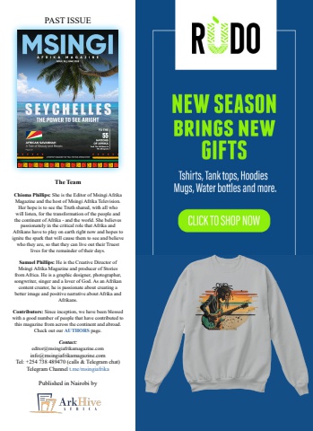 PAST ISSUEThe TeamChioma Phillips: She is the Editor of Msingi Afrika Magazine and the host of Msingi Afrika Television. Her hope is to see the Truth shared, with all who will listen, for the transformation of the people and the continent of Afrika - and the world. She believes passionately in the critical role that Afrika and Afrikans have to play on earth right now and hopes to ignite the spark that will cause them to see and believe who they are, so that they can live out their Truest lives for the remainder of their days.Samuel Phillips: He is the Creative Director of Msingi Afrika Magazine and producer of Stories from Africa. He is a graphic designer, photographer, songwriter, singer and a lover of God. As an Afrikan content creator, he is passionate about creating a better image and positive narrative about Afrika and Afrikans. Contributors: Since inception, we have been blessed with a good number of people that have contributed to this magazine from across the continent and abroad. Check out our AUTHORS page.Contact: editor@msingiafrikamagazine.cominfo@msingiafrikamagazine.comTel: +254 738 489470 (calls & Telegram chat)Telegram Channel t.me/msingiafrikaPublished in Nairobi by